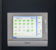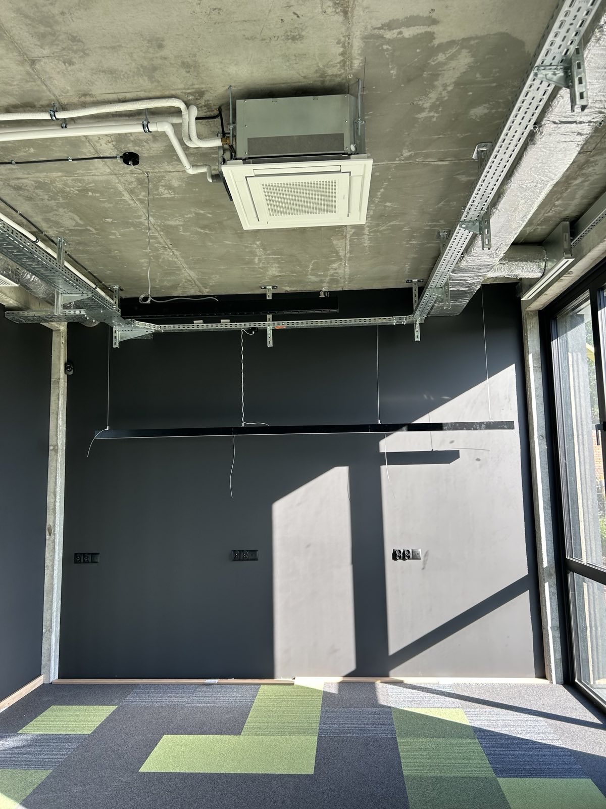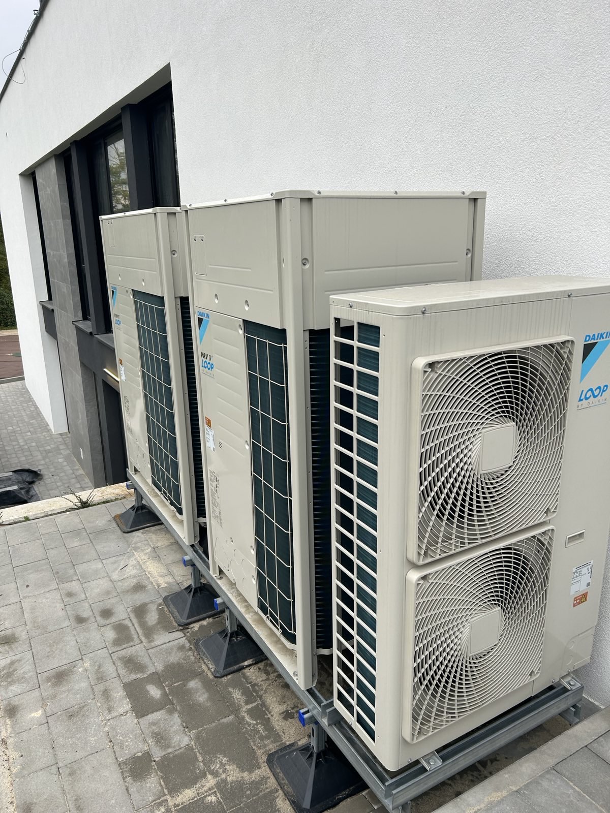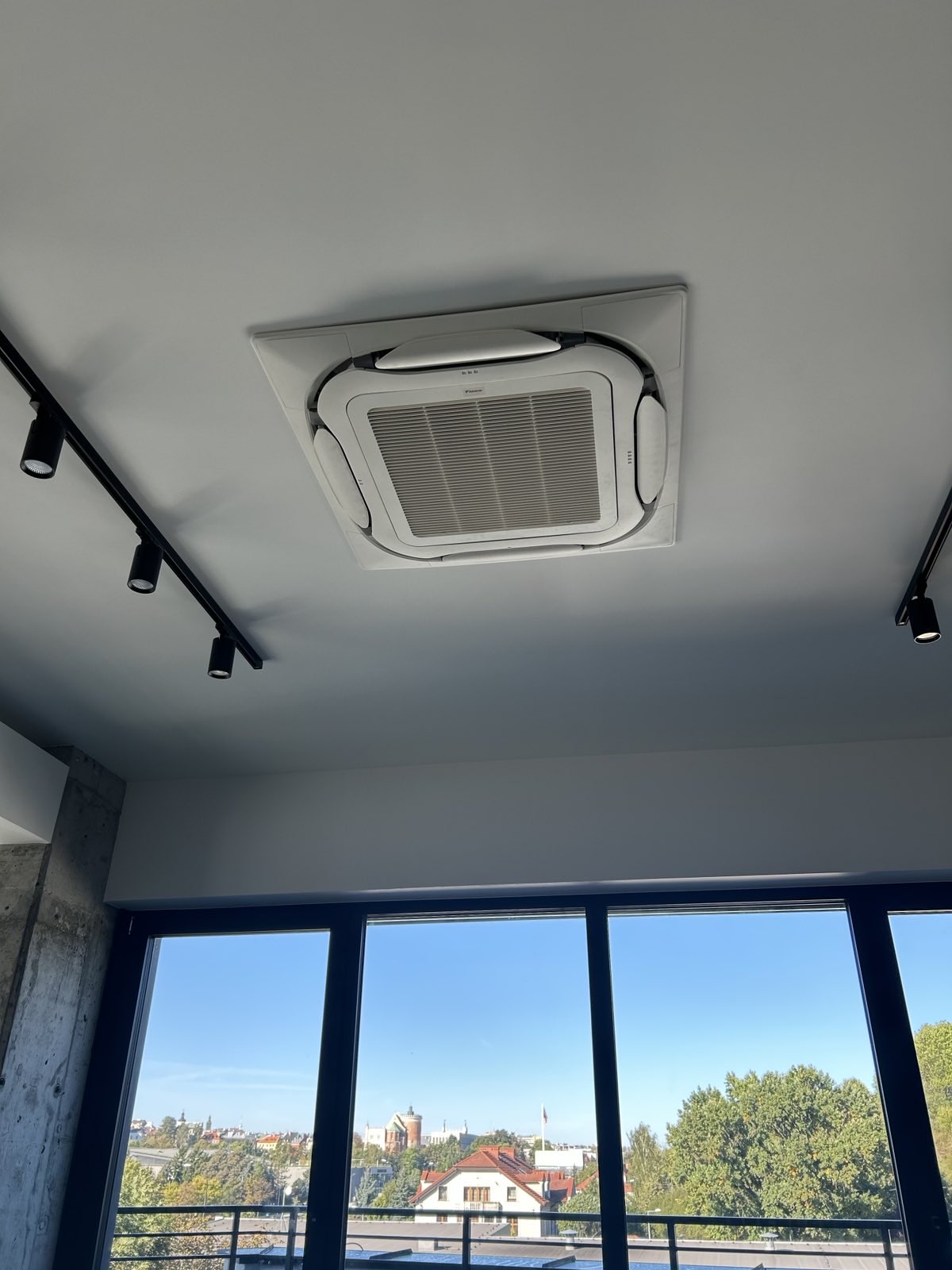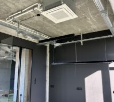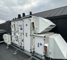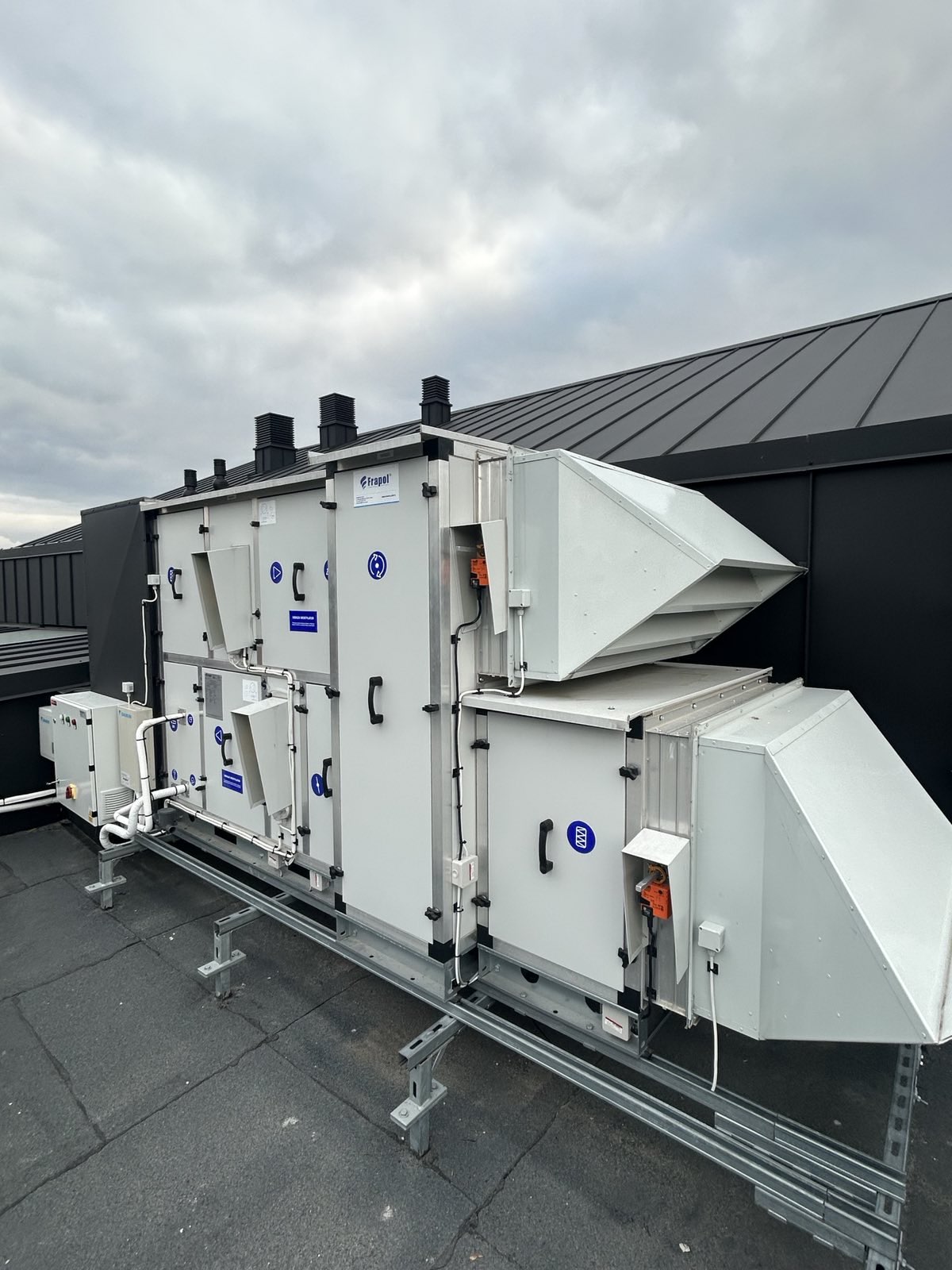 Układ wyposażono w dwie centrale wentylacyjne nawiewno – wywiewne dachowe firmy Frapol z odzyskiem ciepła i nagrzewnico-chłodnicą elektryczną. Zaprojektowano również wentylatory kanałowe oraz kurtyny powietrzne. Zamontowana zostanie także duża instalacja grzewczo – chłodząca VRV z odzyskiem ciepła.